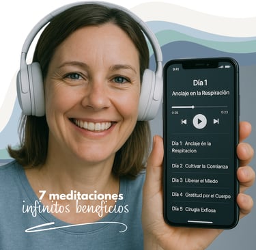 7 meditaciones guiadas + 2 de emergencia con enfoque terapéutico, estructuradas según principios de neurocalma y psicoeducación, grabadas por un narrador profesional entrenado en técnicas de inducción y relajación profunda.